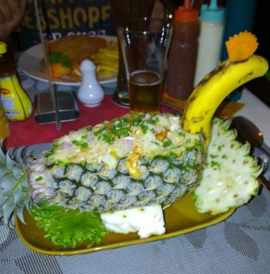 ...Restaurant, am Berg, direkt an einem Ananasfeld. Im Lokal (gutes Essen) gabe es auch 2 Affen die an der Leine waren. Da wurde unsere Urlaubsbekanntschaft (der Mann) vom Affen gebissen. Deshalb Abends zu Doc wegen Spritzen.