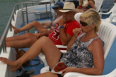 Gegen 9 Uhr hat uns heute Dhambii (so hieß wohl unser Skipper) pünktlich abgeholt. Leider war es etwas dunstig heute, deshalb nicht nur klare Sicht. Aber sicher auch, kein Nebel, wie's jetzt Zuhause schon mal ist.